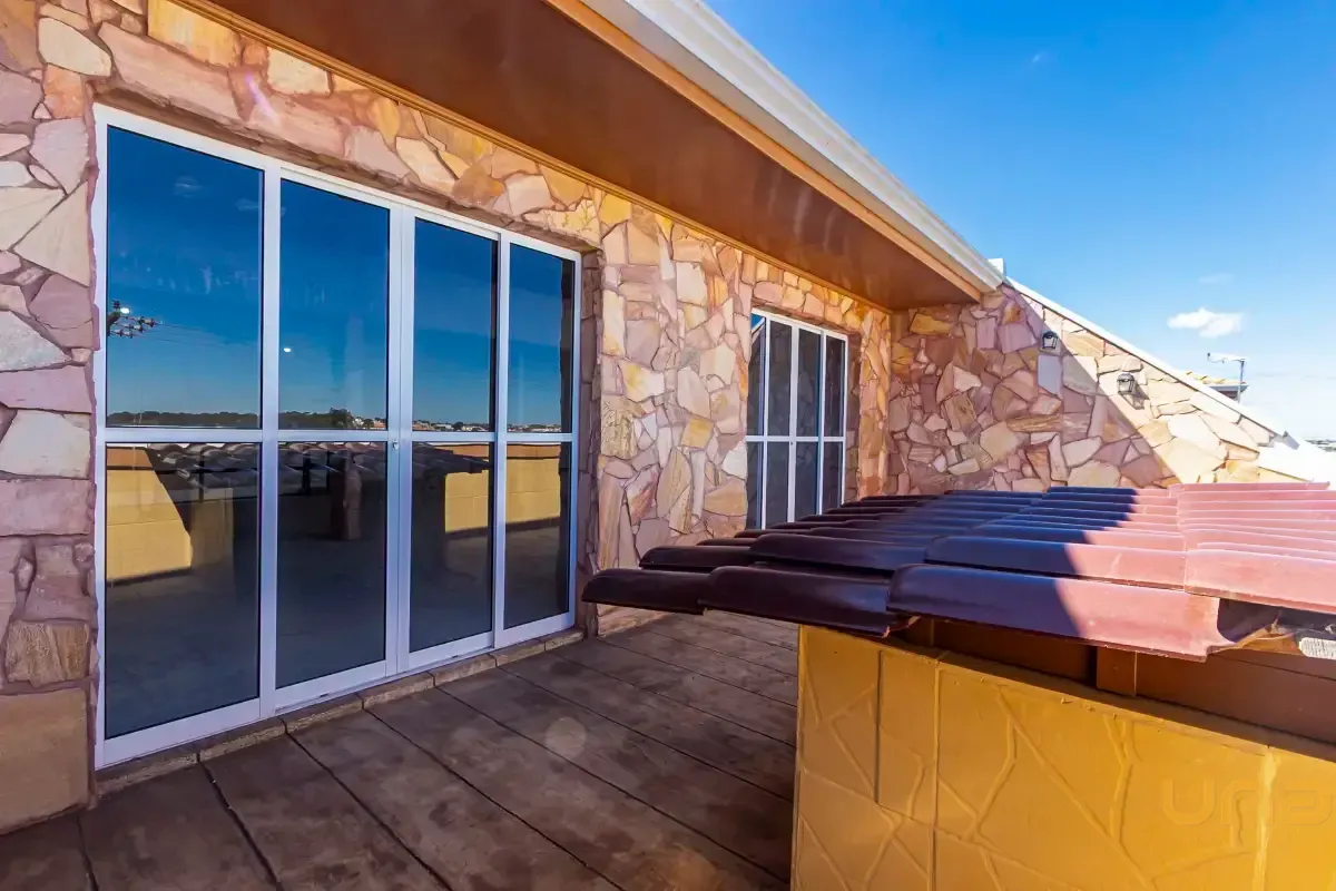 Telhado com telhas de barro e ecológicas, fachada moderna com Blindex e detalhes em pedra Rosa Carmel Mountain Split, além de pisos em cerâmica e taco, que unem durabilidade e charme.
