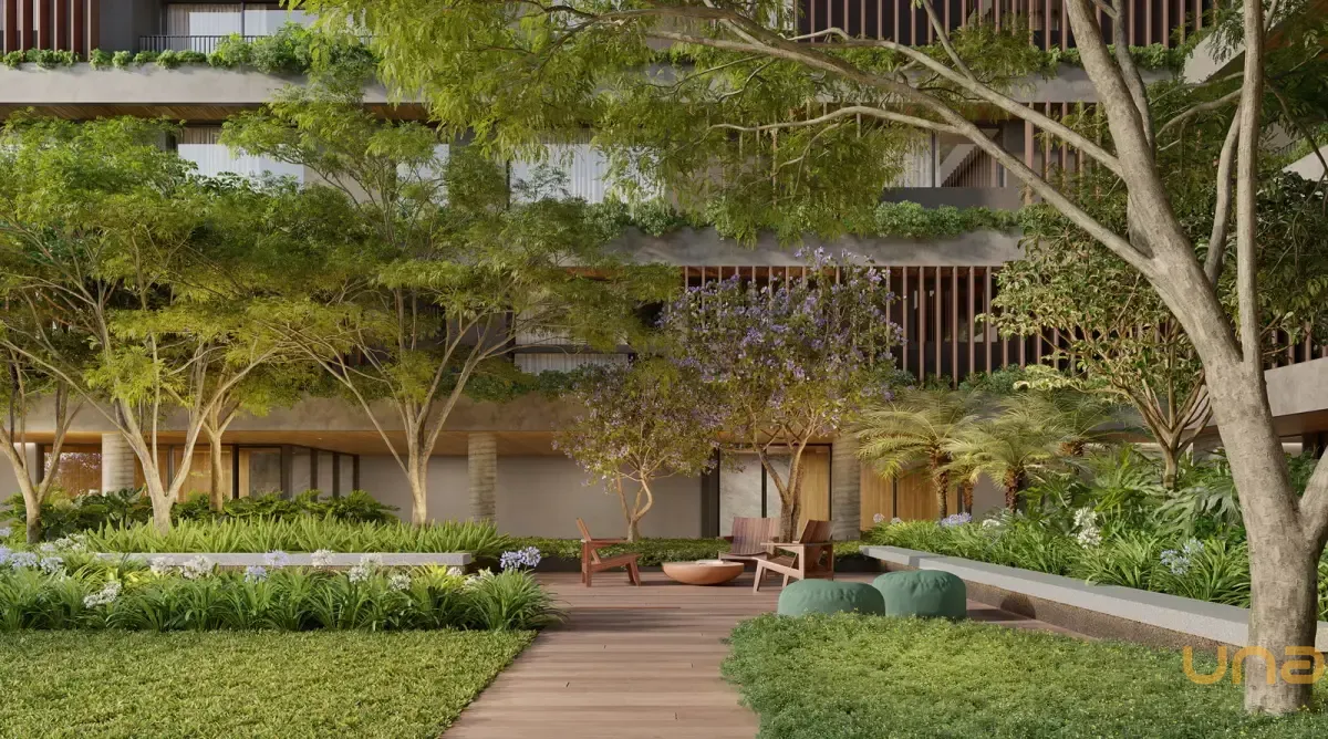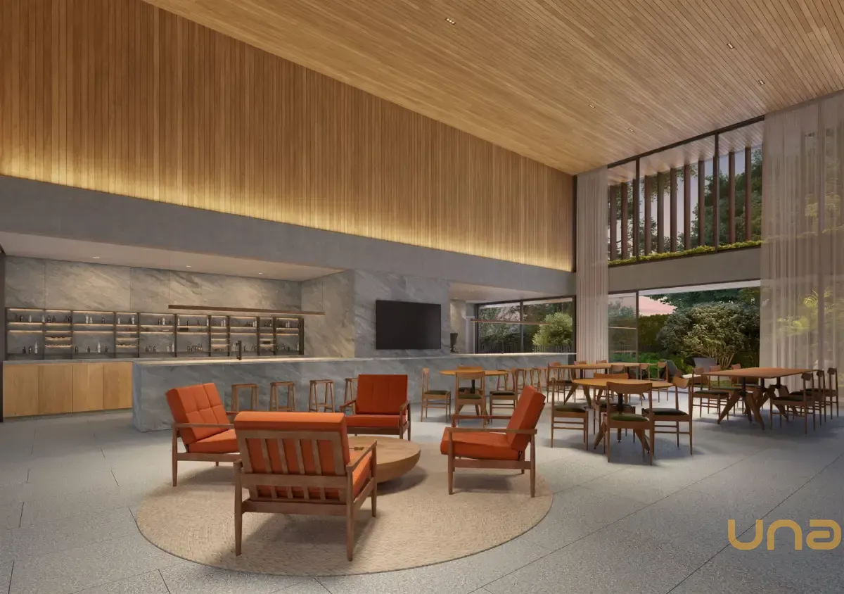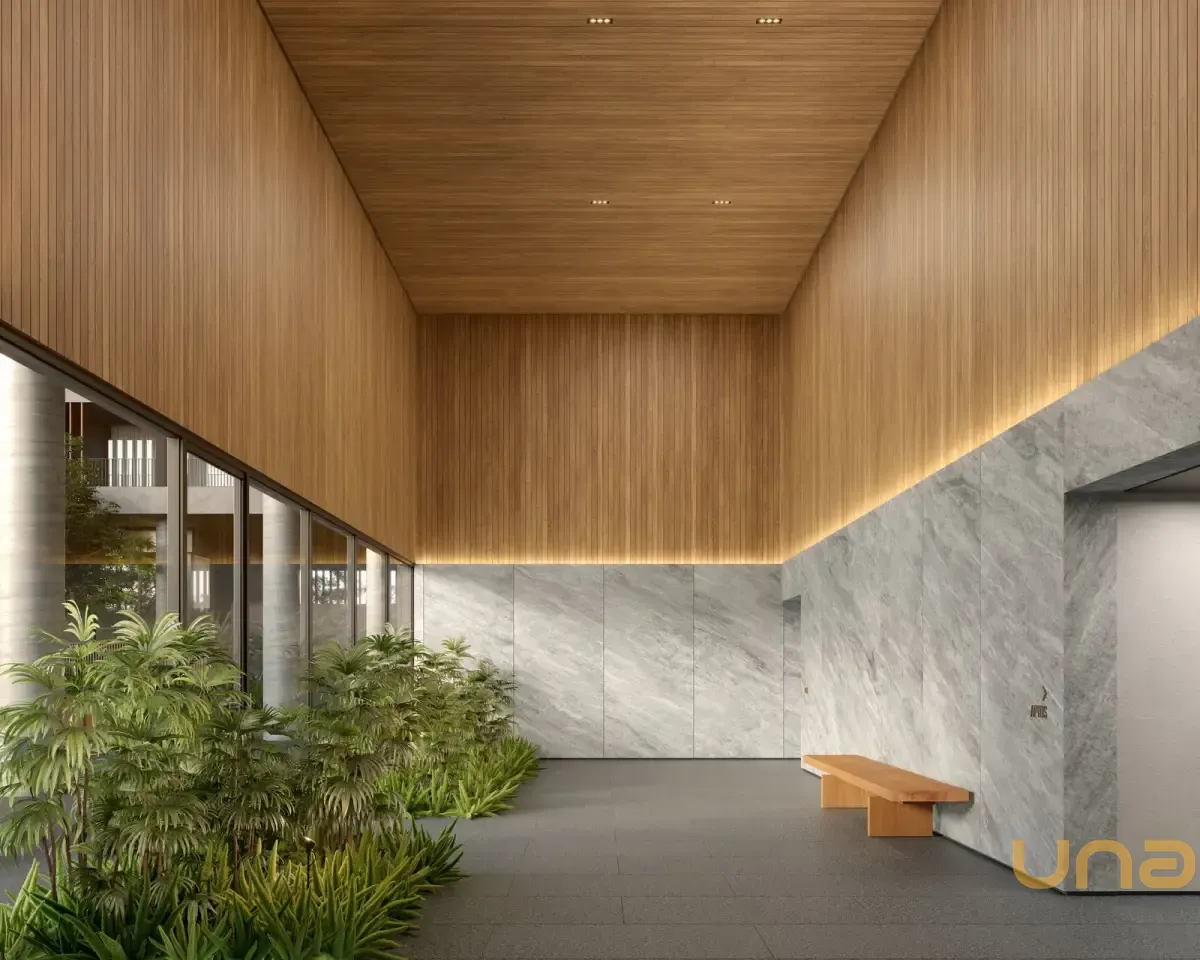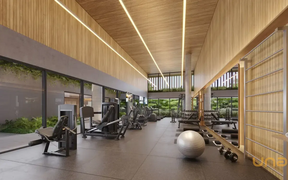 Condomínio Kaá | Comodidades: banheiro família, hall social, quadra de areia, quadra poliesportiva coberta, espaço diversão, brinquedoteca e espaço pet, piscinas coberta, descoberta, térmica, infantil e adulto, além de academia, espaço saúde e bem-estar, sauna e sala de jogos. Dispõe também de salão de festas, lounge, espaço gourmet, horta e bicicletário, escritórios, depósitos privativos, central de entregas e correspondências, vagas de visitantes (inclusive cobertas), além de vestiários e copa para funcionários, guarita blindada, eclusas social, de serviço e de veículos, além de acesso aos halls sociais com reconhecimento facial e elevadores sociais com biometria. O condomínio também oferece o aplicativo My Wellness para gestão de atividades.