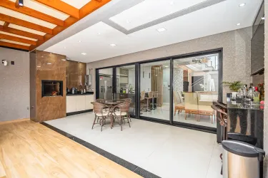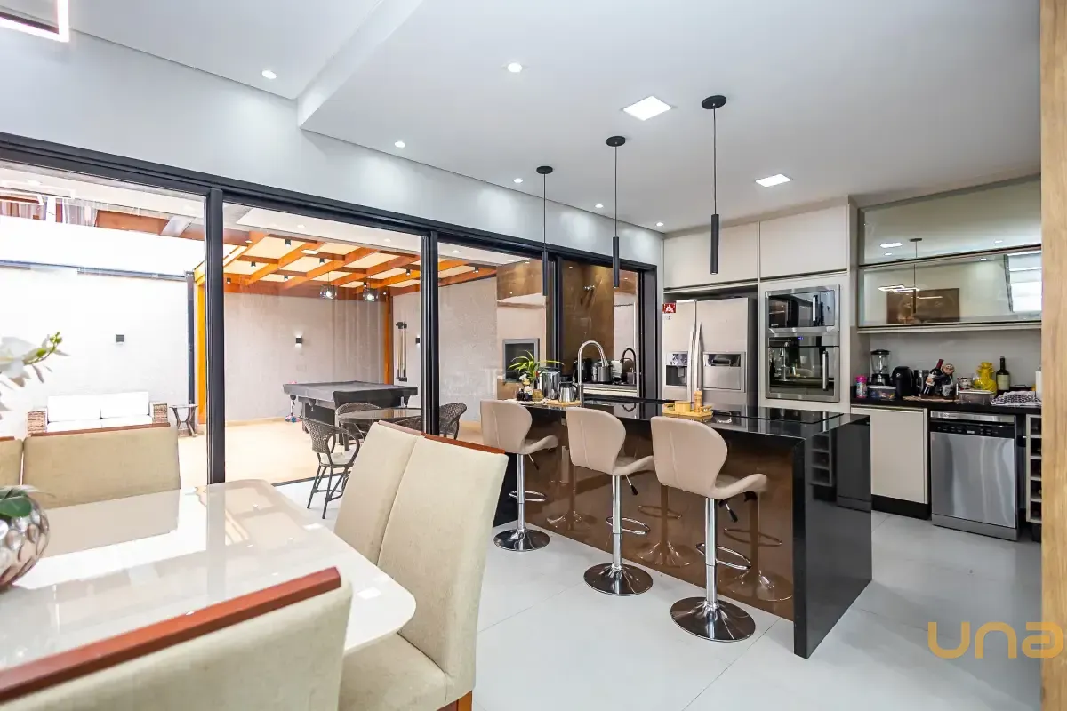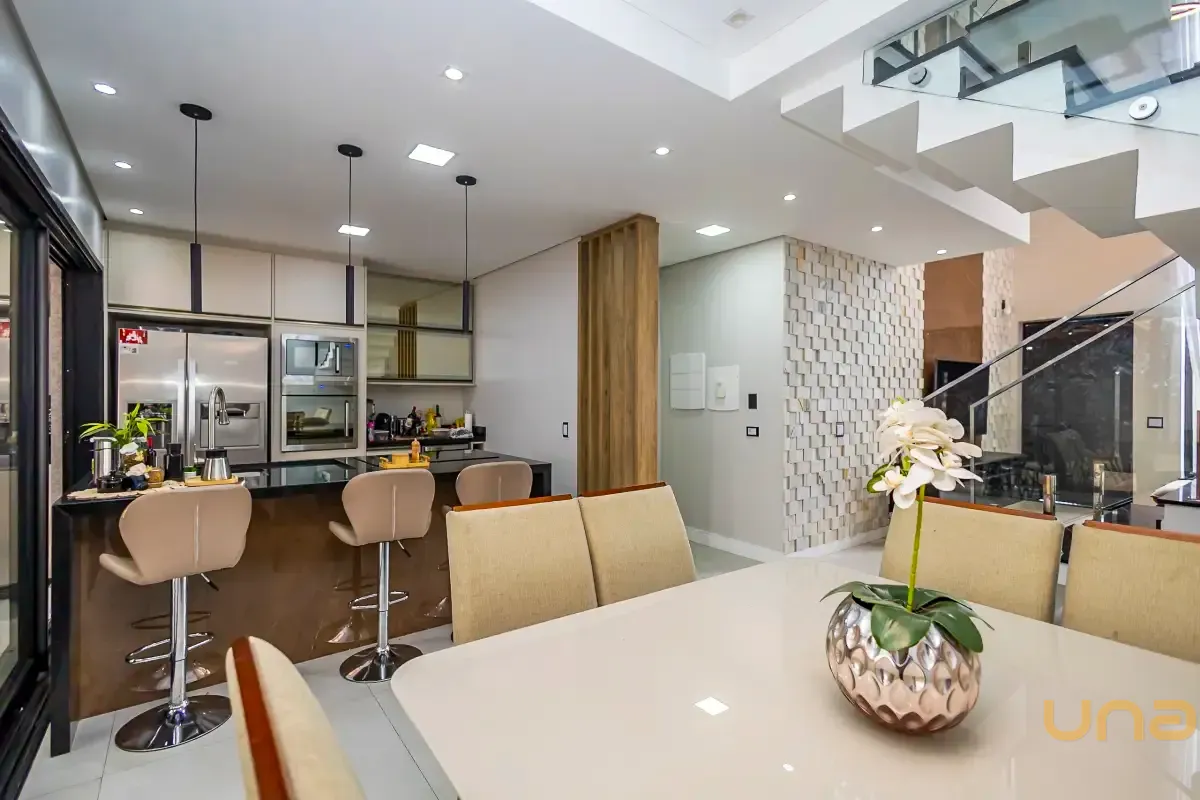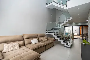 Casa distribuído de forma funcional, com excelente padrão de acabamento. O imóvel conta com uma ampla sala para dois ambientes, equipada com sofá confortável, painel em madeira com TV e elegante revestimento em parede 3D, que agrega sofisticação ao espaço. A integração com a cozinha, o espaço gourmet e a sala de jogos proporciona um layout moderno, ideal para convivência e recepção de convidados.