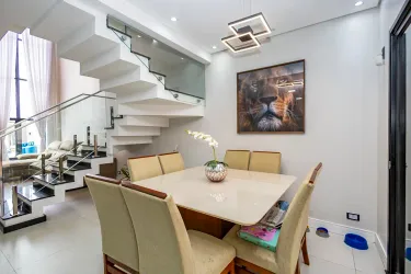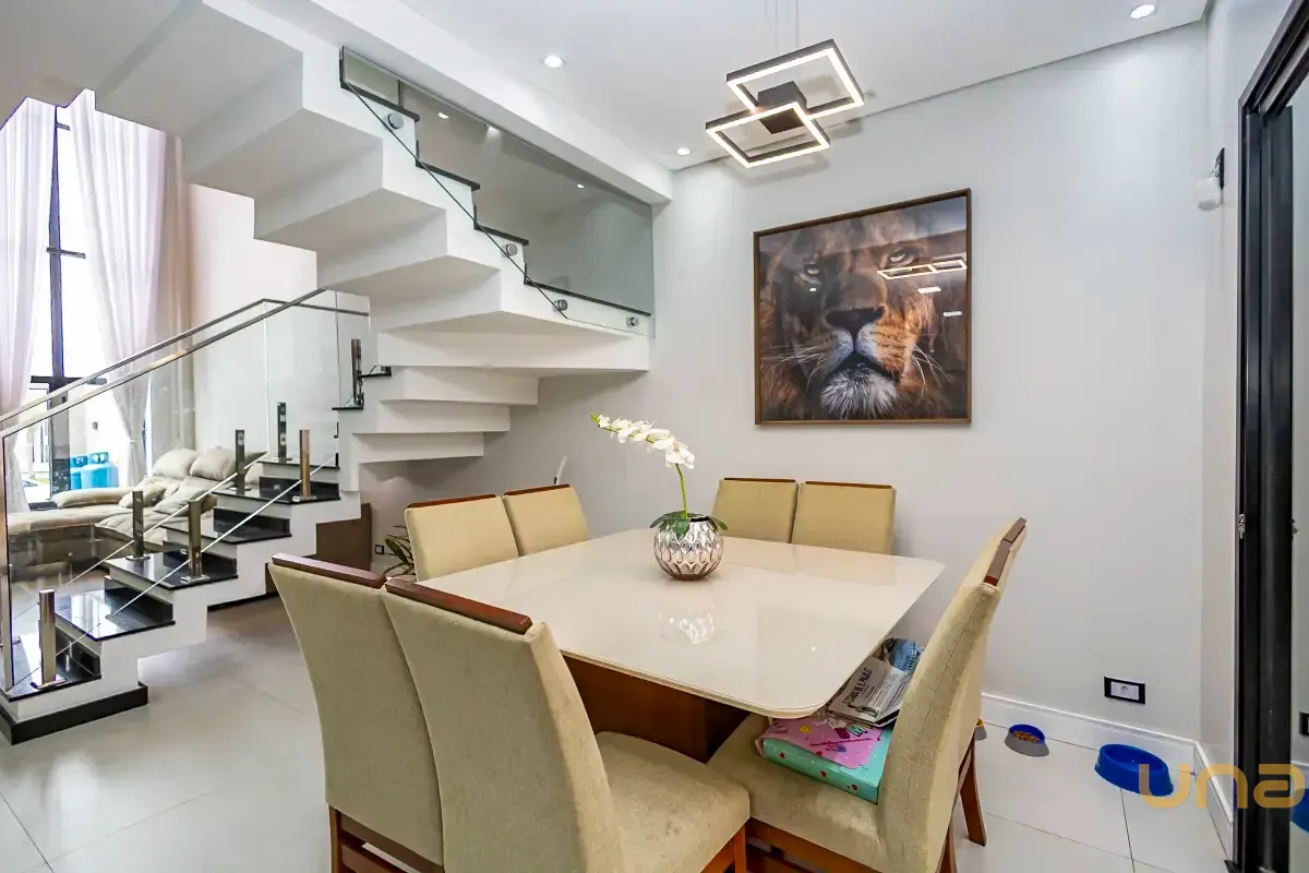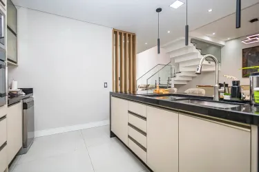A escada, com estrutura contemporânea, degraus em destaque e guarda-corpo em vidro, reforça o design atual do imóvel, conectando os ambientes de maneira leve e harmoniosa.