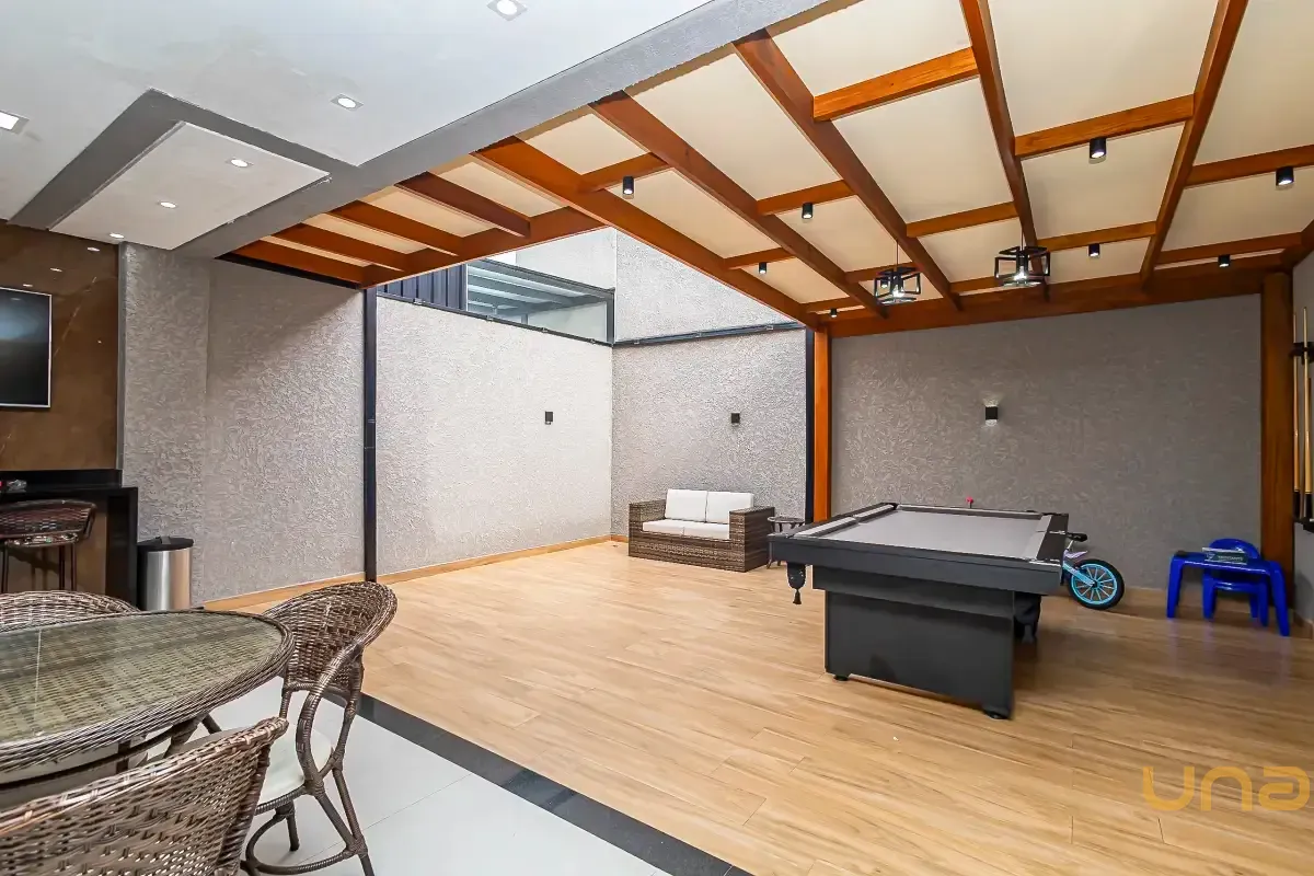 Na área externa, o espaço gourmet se destaca pelo ambiente coberto, com estrutura em madeira e iluminação embutida. O piso em tom amadeirado traz aconchego, enquanto o espaço dispõe de mesa para refeições, área de estar e mesa de jogos (sinuca), ideal para momentos de lazer.