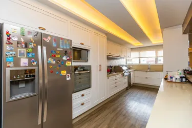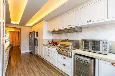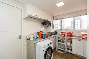 A cozinha, clara e funcional, conta com armários planejados e se conecta a uma área de serviço espaçosa, proporcionando praticidade no dia a dia.