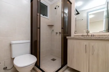 Banheiro social com armário e box blindex;