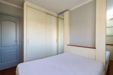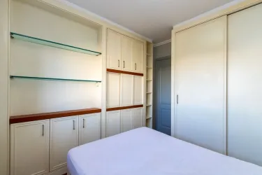Dormitório com cama box e armários;