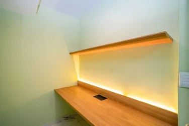 O apartamento conta com três quartos, sendo uma suíte, além de um banheiro social, todos decorados e com armários planejados. A cozinha tem conceito aberto e armários planejados, a área de serviço ampla conta com uma surpresa no quarto de serviço, que foi transformado num lindo escritório.