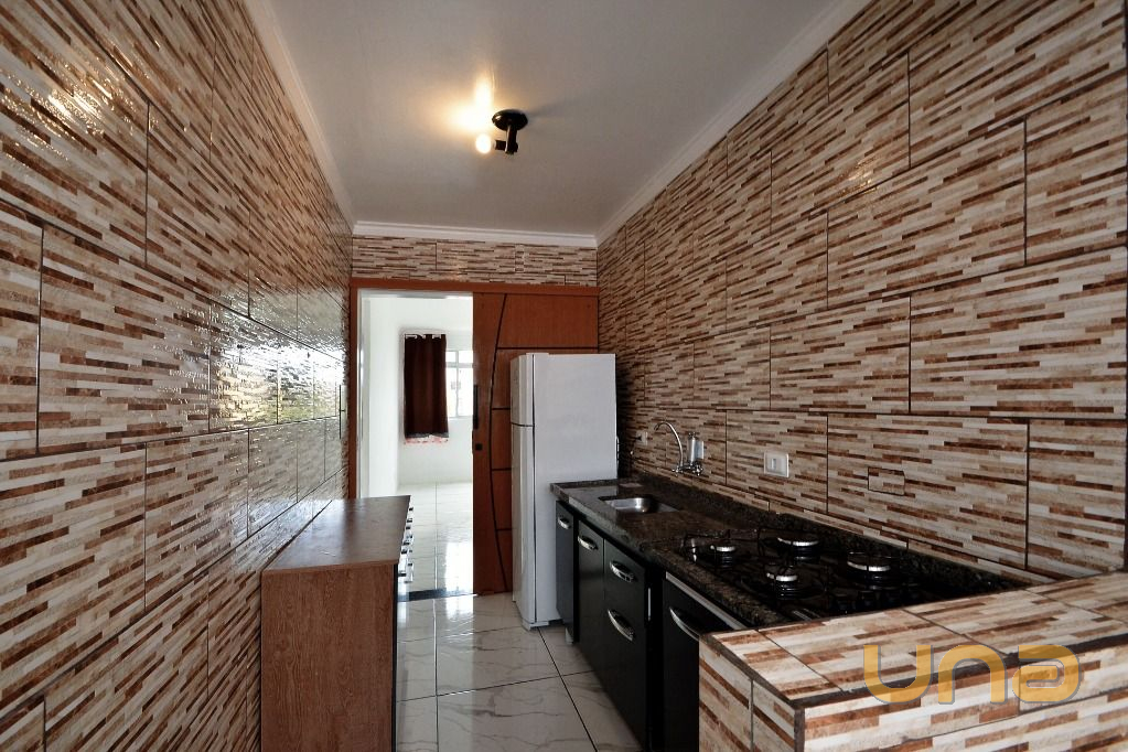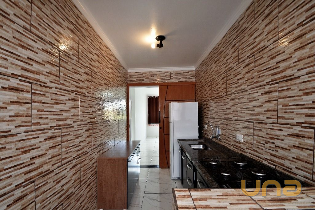 - Cozinha com armários planejados, geladeira e cooktop