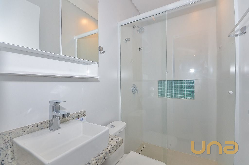 - Banheiro social com armário, espelho e Box de Vidro.