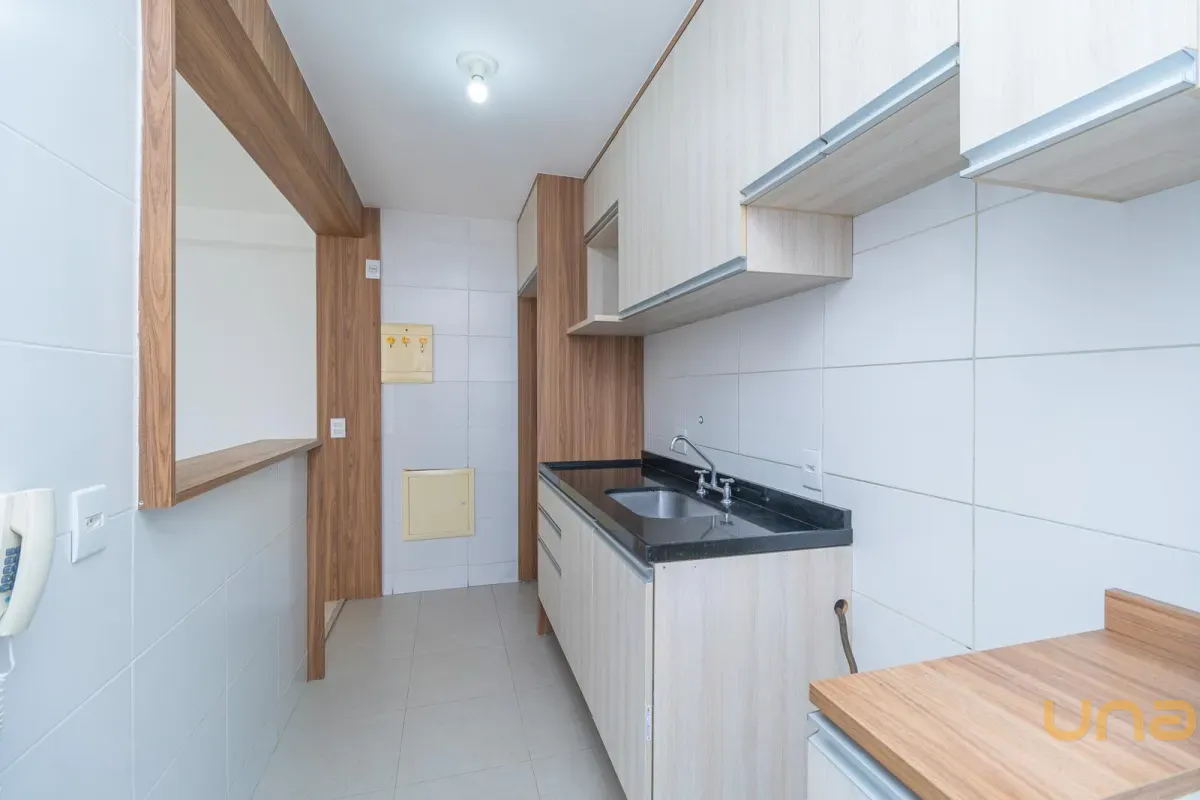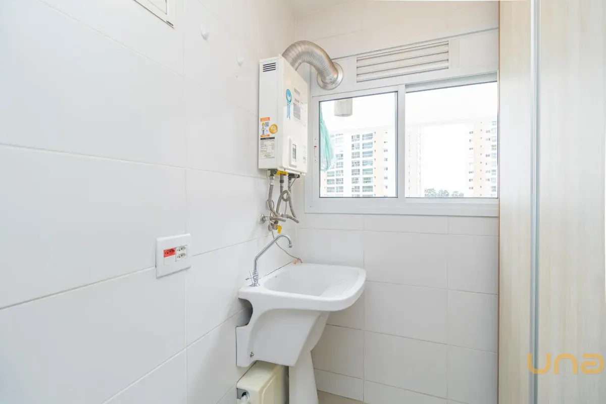 A cozinha em conceito americano, equipada com móveis planejados e bancada funcional, oferece praticidade no dia a dia, complementada por uma área de serviço organizada e discreta.