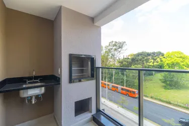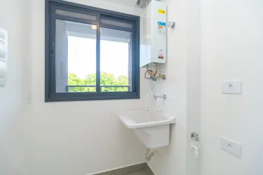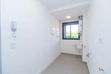 O imóvel conta com sala ampla para dois ambientes e acesso à sacada com churrasqueira a carvão. A cozinha é integrada ao ambiente e possui lavanderia anexa com tanque.