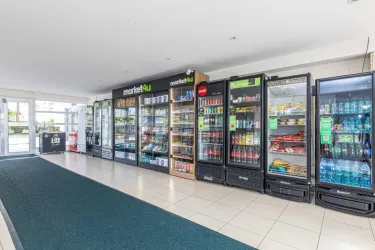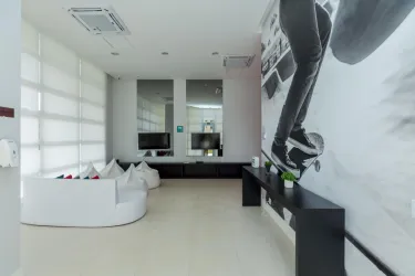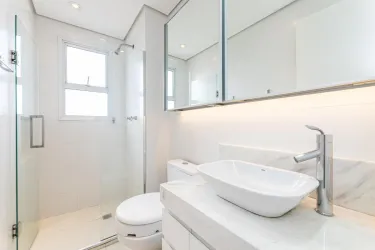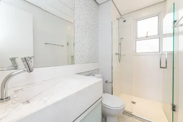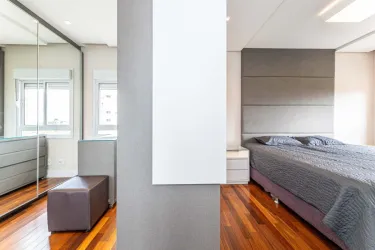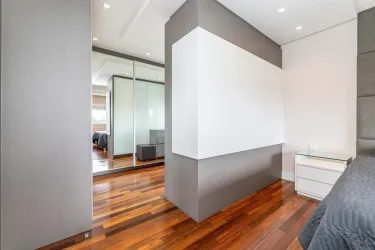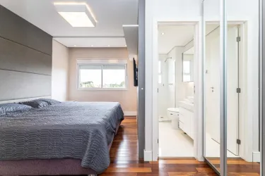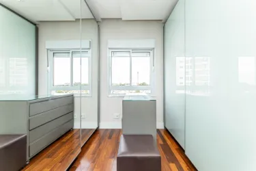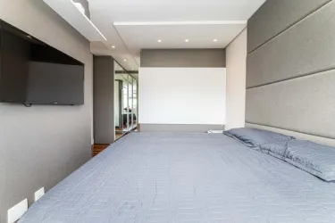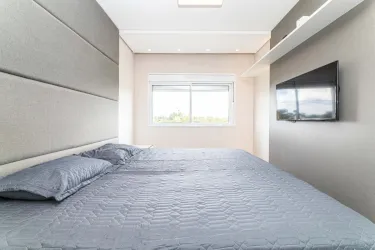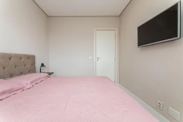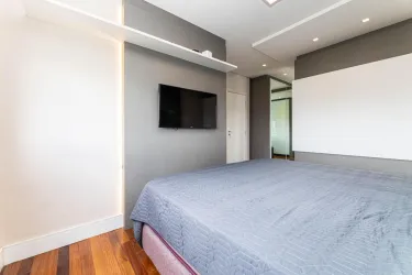 - Na área íntima, são 2 quartos, sendo uma suíte com closet, cama queen size e TV, e um segundo quarto vazio, ideal para adaptação conforme a sua necessidade. O banheiro social conta com armário, espelho e box em blindex.