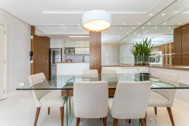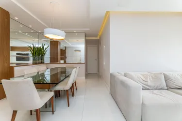 - O imóvel conta com sala ampla para 2 ambientes, equipada com mesa de jantar, sofá, rack e painel com TV, além de adega para vinhos, proporcionando um ambiente aconchegante e elegante. A sacada possui fechamento em vidro, churrasqueira e bancada, perfeita para momentos de lazer e confraternização.