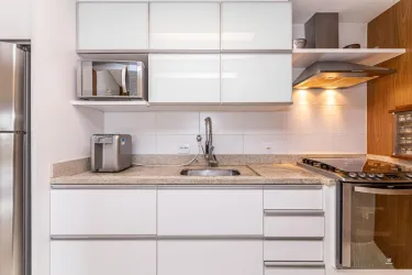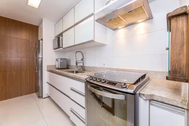 - A cozinha é completa, com armários planejados, geladeira, fogão, coifa e micro-ondas, integrada a uma lavanderia funcional com armário e máquina lava e seca.