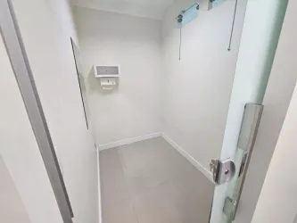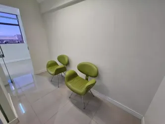 Recepção com mesa, balcão, cadeiras, filtro de agua, depósito com armários com pia em granito, 02 pequenos consultórios , e 01 grande sala com armários, banheiro com armários e espelho.