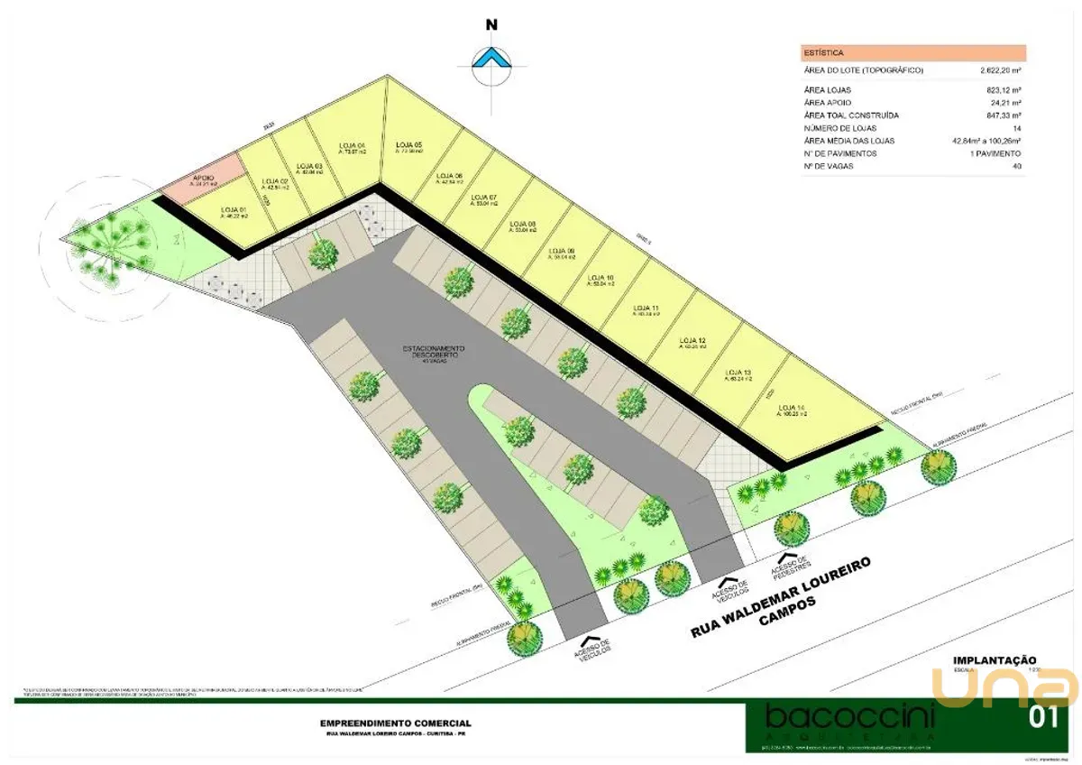 - Conceito Strip Mall: lojas em espaço aberto, com paisagismo moderno e integração ao bairro;