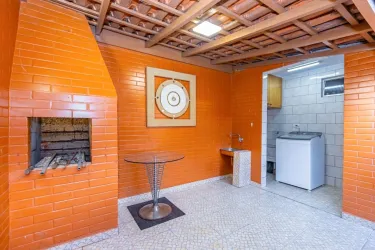 - Área externa fundos: Área gourmet coberta com churrasqueira e área de aberta de quintal/jardim todo em piso de concreto.
